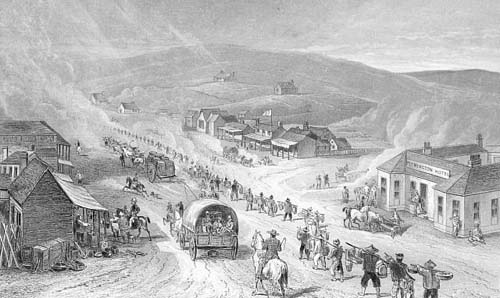 Image: Off to the diggings - Flemington, near Melbourne From: How to farm and settle in Australia Text: A lady’s visit to the gold diggings of Australia in 1852-53 Author: Mrs Charles Clacy |