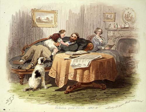 Image: Lucky digger that returned Artist: S.T. Gill Text: Letters from a miner in Australia Author: Antoine Fauchery |